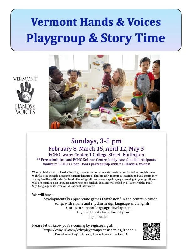 Hosted by Vermont Hands & Voices, to connect D/HH kids across Vermont. To get the Zoom link, send us a message at [email protected] or on Facebook at vthandsandvoices, and let us know your name, age, and communication preferences.