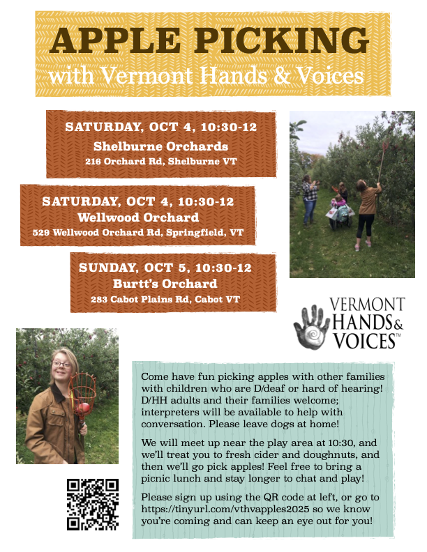 Come have fun picking apples with other families with children who are D/deaf or hard of hearing! D/HH adults and their families welcome; interpreters will be available to help with conversation. Please leave dogs at home. We're meeting in 3 different locations, so choose the location and date that works best for you: