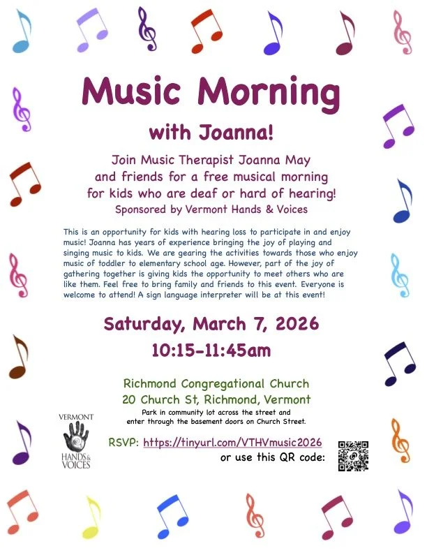 This is an opportunity for kids with hearing loss to participate in and enjoy music! Joanna has years of experience bringing the joy of playing and singing music to kids. We are gearing the activities towards those who enjoy music of toddler to elementary school age. However, part of the joy of gathering together is giving kids the opportunity to meet others who are like them. Feel free to bring family and friends to this event. Everyone is welcome to attend! A sign language interpreter will be at this event!